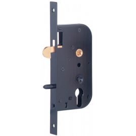 Serrure à larder de porte coulissante Axe à 50 mm Pour cylindre européen, à mentonnet et fouillot, fournie avec gâche Coffre acier embouti epoxy noir Têtière acier Pêne crochet laiton Gâche plate acie rFouillot carré de 7 mm, entr'axe 70 mm